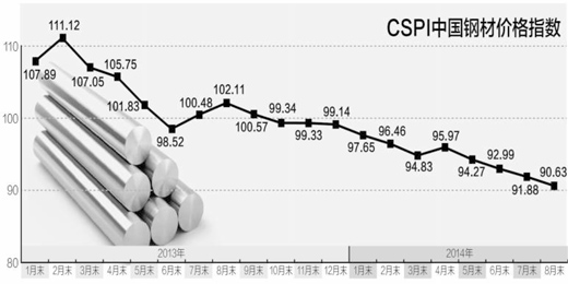跌,又跌,還在跌!進(jìn)入2014年,鋼材價格下跌態(tài)勢依舊穩(wěn)固。上半年,重點(diǎn)統(tǒng)計(jì)鋼企的鋼材銷售結(jié)算價格降至3212元/噸,相當(dāng)于每斤1.6元,與超市白菜價格相差無幾;8月末,鋼鐵協(xié)會鋼材綜合價格指數(shù)已跌至90.63點(diǎn),為2003年6月以來的最低水平。